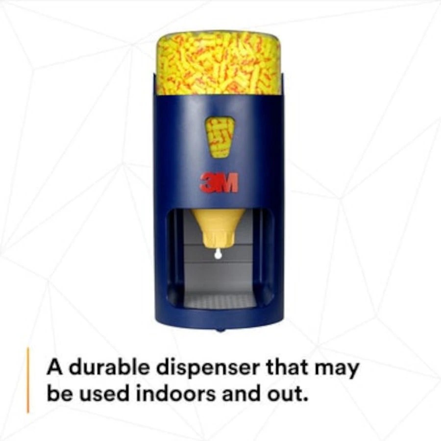 3M™ One Touch™ Pro Earplug Dispenser makes it easy for workers to get the earplugs they need on the job. The dispenser holds 400 500 pair of earplugs that are dispensed one at a time. A simple turning motion drops an earplug into the worker’s hand. Because the dispensing of earplugs is controlled, there should be little waste. Our dispenser also makes it more sanitary for workers to get their earplugs. It eliminates the practice of workers reaching into a bin and touching multiple earplugs while taking the ones they need. This feature is especially important considering that workplace hands are often soiled with various contaminants. A durable dispenser that may be used indoors and out The dispenser is made from durable ABS and POM plastic to withstand harsh environments, whether that is indoors or outside. The plastic construction holds up under sunlight, rain and wind. When placed outdoors, the dispenser will shelter and keep earplugs safe from rain, sleet and snow. Drainage holes won’t allow rainwater to collect in the bottom of the dispenser. Locate earplugs wherever it’s most convenient for workers When earplugs are conveniently located, it often boosts hearing protection compliance rates among workers. This dispenser may be placed on flat, level surfaces such as countertops, or wall mounted in a convenient place. For wall mounting applications, a powder coated steel backplate is included. Reduce Waste Because the dispenser uses earplugs that are not individually wrapped in plastic, there is less packaging waste, workers don’t stuff their pockets with bits of plastic wrap, or worse yet drop the wrappers as litter. Additionally, earplugs sold in this manner are generally sold at a more economical price point.