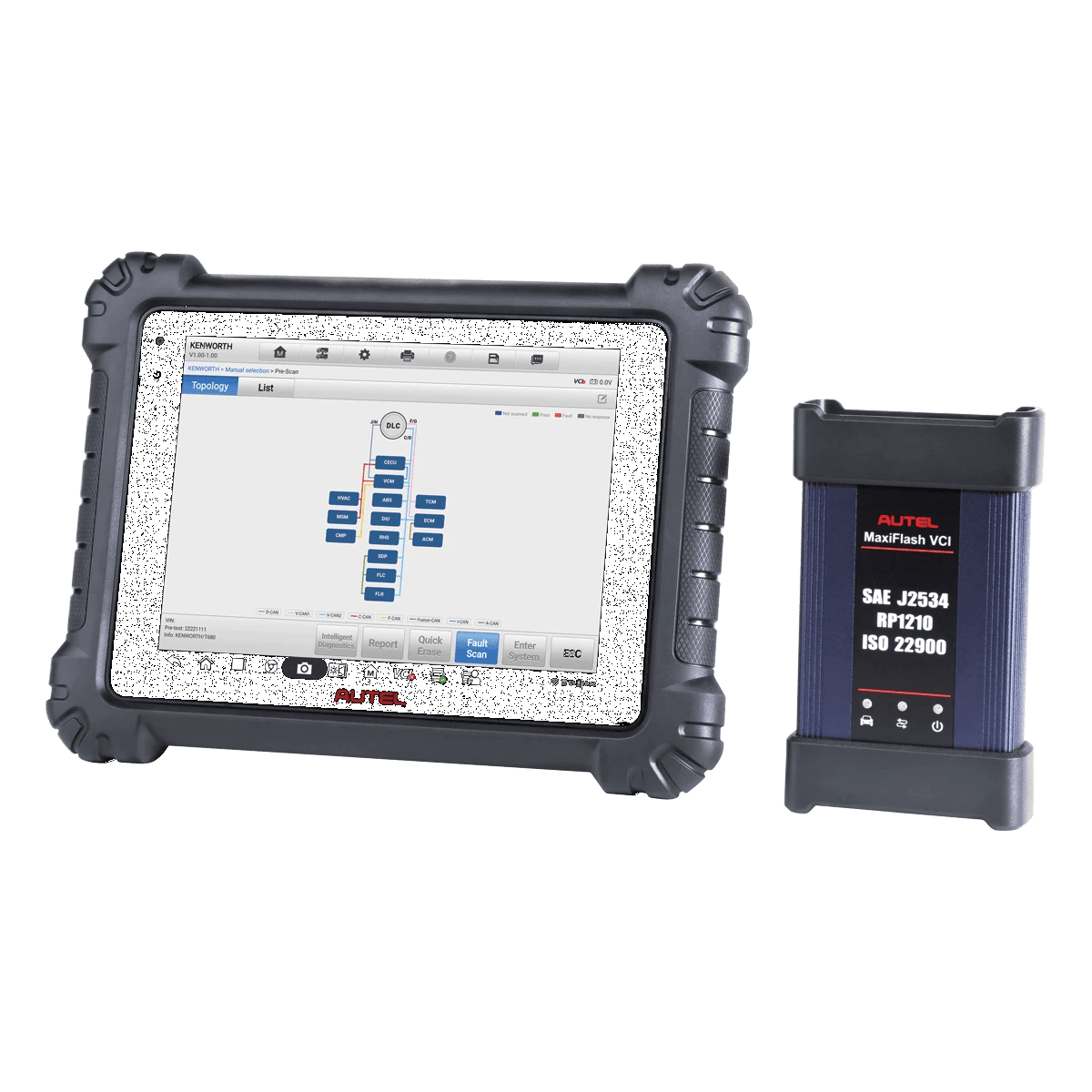 The Autel MaxiSYS MS909CV is an advanced commercial vehicle diagnostic tablet compatible with 80+ models of light, medium and heavy duty vehicles. The 9.7-inch wireless Android-based touchscreen tablet performs extensive diagnostics including the ability to read/erase codes, view/graph live data, and perform active tests. The tablet includes a Bluetooth-enabled vehicle communication interface (VCI)/J2534 pass-thru programmer, the MaxiBAS B200 battery/starting/charging system test device, alligator clamps, multimeter and amp clamps. The tablet also includes ADAS Calibration Software for Class 3-5 vehicles and Class 6-8 vehicles with dynamically calibrated systems. The MS909CV includes one year limited warranty and a year of free software updates.