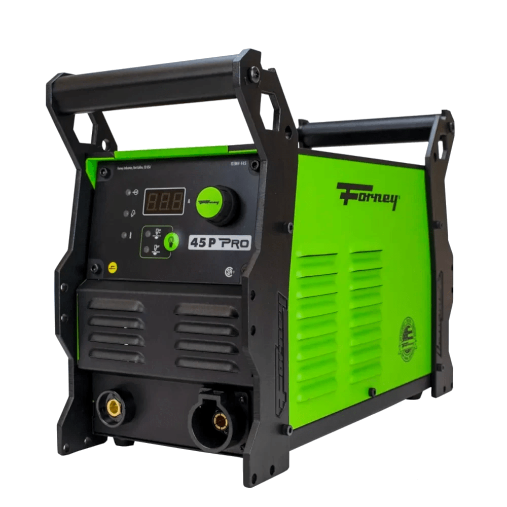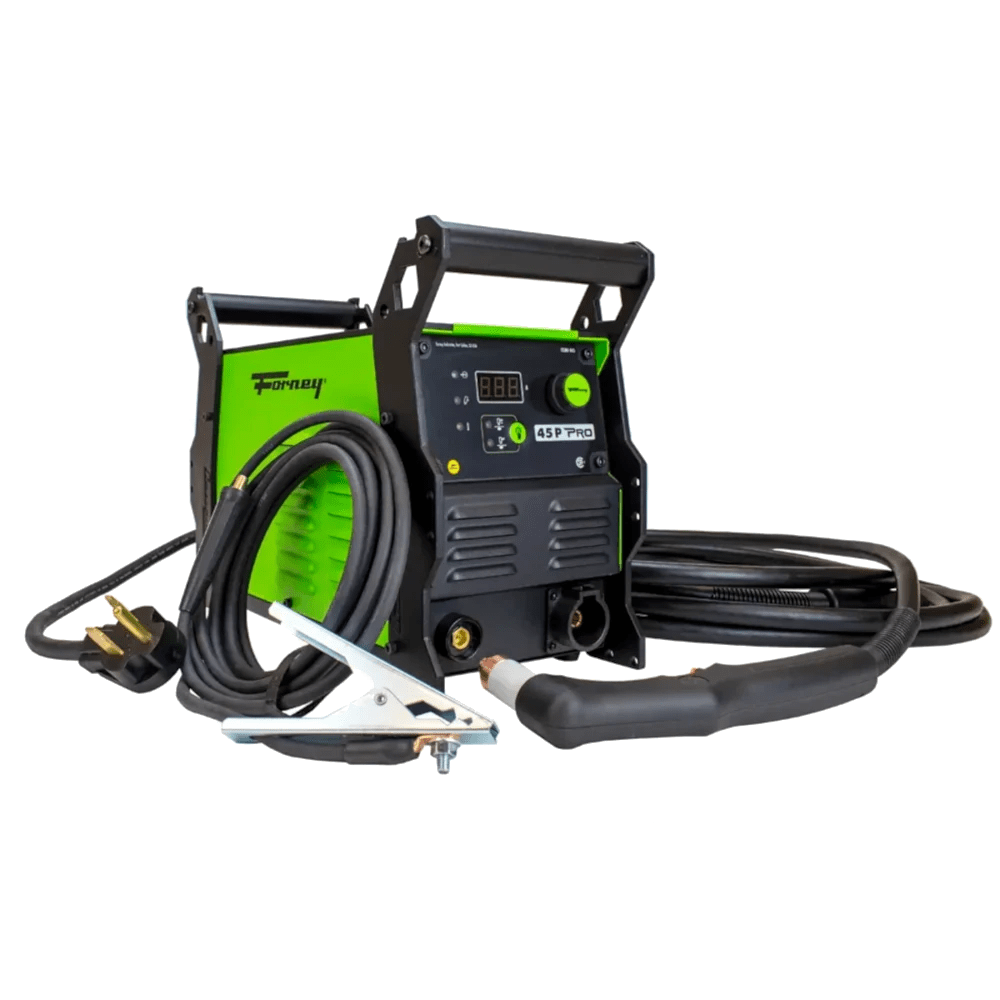 Forney Industries’ powerful, professional grade dual-voltage plasma cutter can clean cut 7/8″ (22.23 mm) at 10 in/min and sever cut 1-1/8″ (28.58 mm) at 5 in/min. With a 15ft (4.57 m) power cable, 25ft (7.62 m) torch lead and lightweight design, Forney’s 45 P Pro has one of the largest work envelopes in the industry. Forney’s 45 P Pro features an all-metal construction, quick-lock torch connection, temperature-controlled fan, and reliable inverter technology.