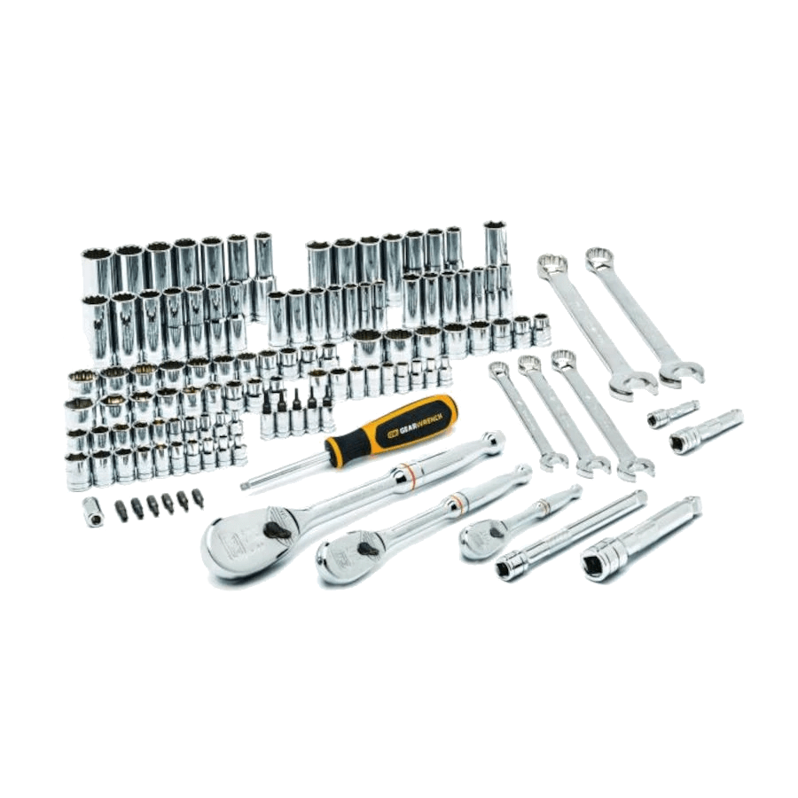 The GEARWRENCH 83001D 168 PC. 1/4″, 3/8″, 1/2” Metric & SAE Mechanics Hand Tool Set includes a 1/4″ ratchet, 3/8″ ratchet, and 1/2″ ratchet that all feature a low profile head and flush mounted reversing lever for greater access. The sockets feature large hard-stamped part numbers and size on both sides of the socket allow for easier viewing of the socket sizes, and double lines (SAE) and knurled lines (metric) for easy SAE vs. Metric identification. Made of full polish, nickel chrome plated alloy steel, the sockets in this set are backed by a lifetime manufacturer’s warranty.