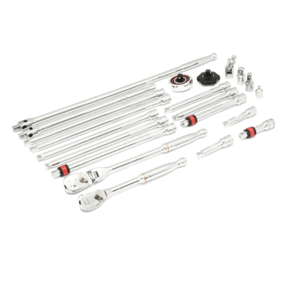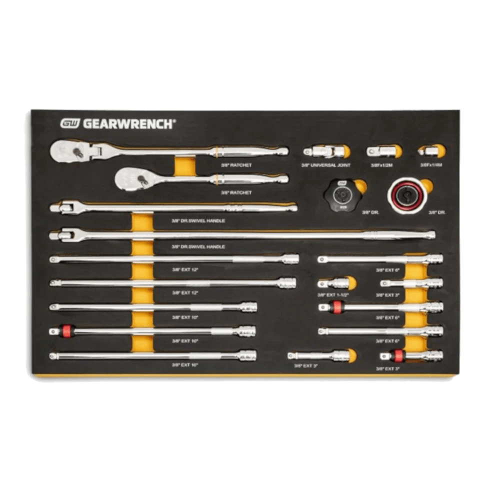 - Set Includes: 3/8″ Drive Extension 1-1/2″, 3/8″ Drive Extension 3″, 3/8″ Drive Extension 6″, 3/8″ Drive Extension 10″, 3/8″ Drive Extension 12″, 3/8″ Drive Universal Joint, 3/8″ Drive 3/8″ F x 1/4″ M Adapter, 3/8″ Drive 3/8″ F x 1/2″ M Adapter, 3/8″ Drive Locking Extension 3″, 3/8″ Drive Locking Extension 6″, 3/8″ Drive Locking Extension 10″, 3/8″ Drive Wobble Extension 3″, 3/8″ Drive Wobble Extension 6″, 3/8″ Drive Wobble Extension 10″, 3/8″ Drive Wobble Extension 12″, 3/8″ Drive Flex Handle/Breaker Bar 12″, 3/8″ Drive Flex Handle/Breaker Bar 18″, 3/8″ Drive 90-Tooth Flex Head Teardrop Ratchet 11″, 3/8″ Drive 72-Tooth Gimbal Ratchet, 3/8″ Drive 72-Tooth Thumbwheel Ratchet, 3/8″ Drive 90-Tooth Teardrop Ratchet 8″