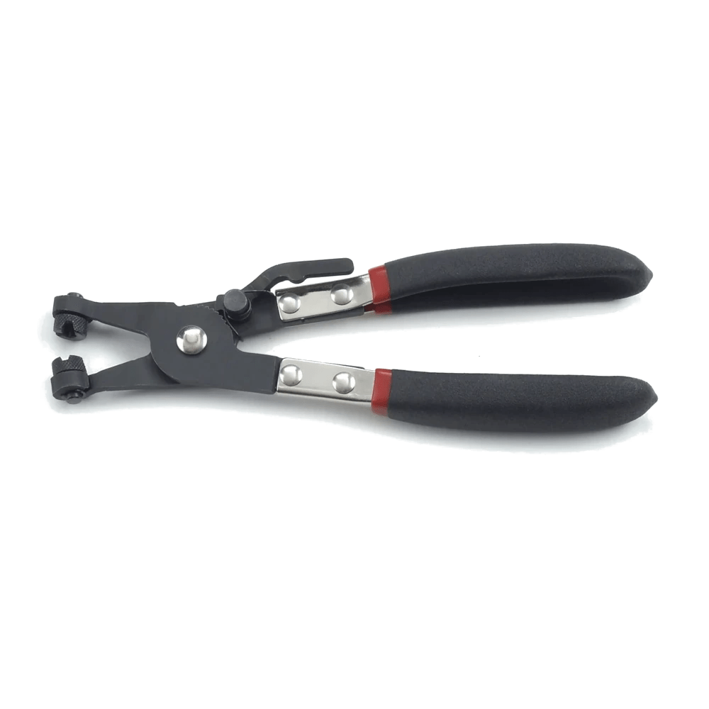 - Plier tips trap and hold the clamp, then swivel for multiple access angles