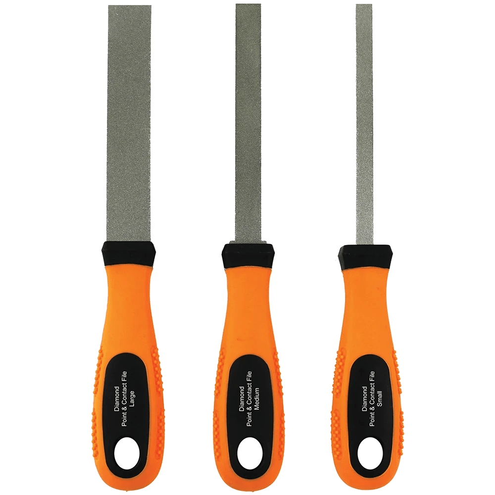 The 3-pc., pro series, Diamond-Coated Flexible Flat Files feature a highly durable, super-hard, and abrasive diamond coating for cleaning and enhancing electrical connections to reduce diagnostic guesswork and increase contact life. The set includes a small (6 mm), medium (9mm) and large (15mm) wide, but ultra-thin, flexible cleaner with ergonomic, non-slip, high-viz handles. Optimized for cleaning large, spade terminals including relays and forklift contacts, these flexible, diamond flat files are also great for use in general filing applications.
