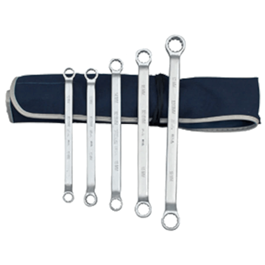 Drop forged Made in USA offset double box end wrenches, come in canvas roll bag. Double offset 45 degree for obstruction clearance with different opening on each end.