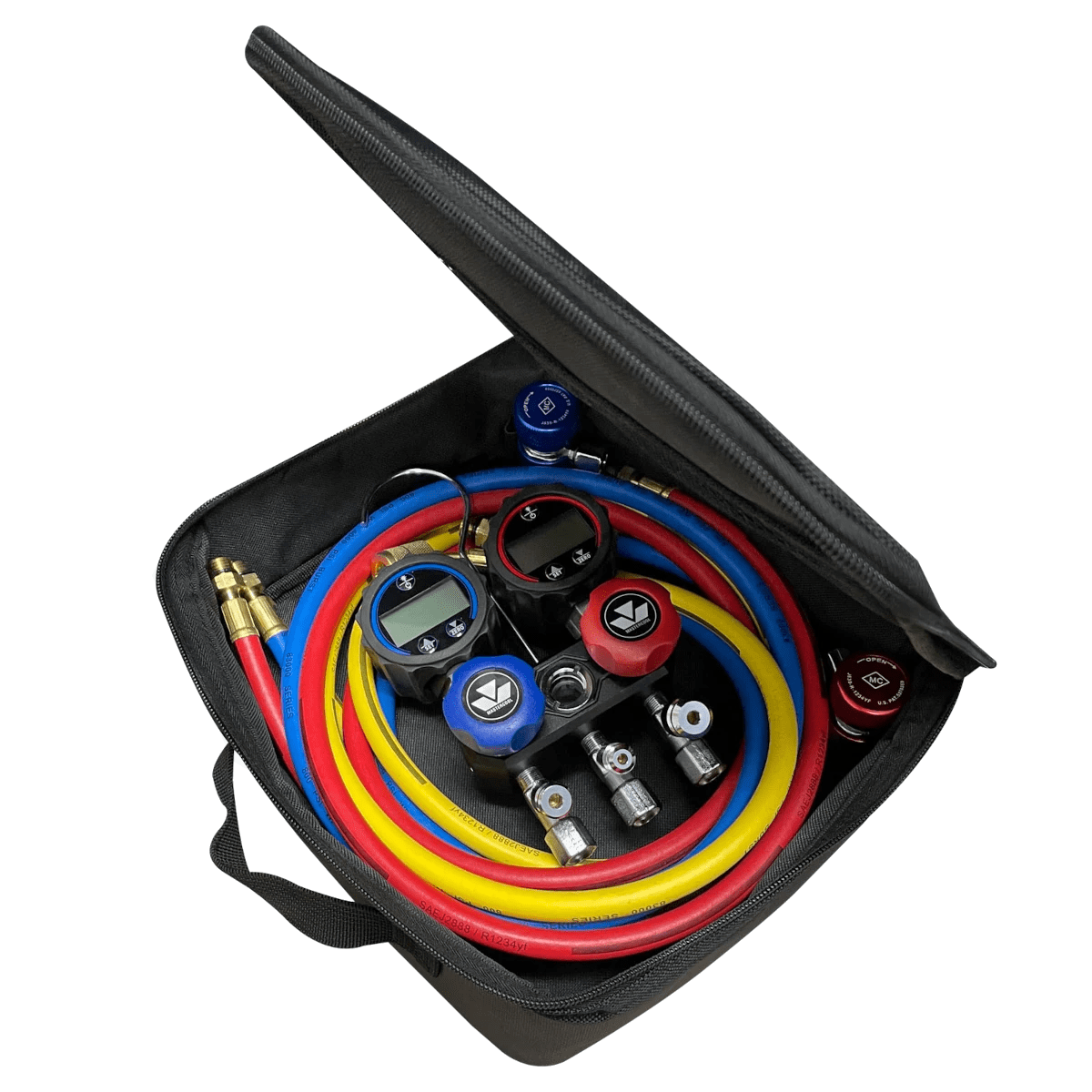 82172: Compact Manifold with 3-72” (182 cm) hoses and R1234yf manual couplers (83834, 83934) packaged in a zippered carry case.