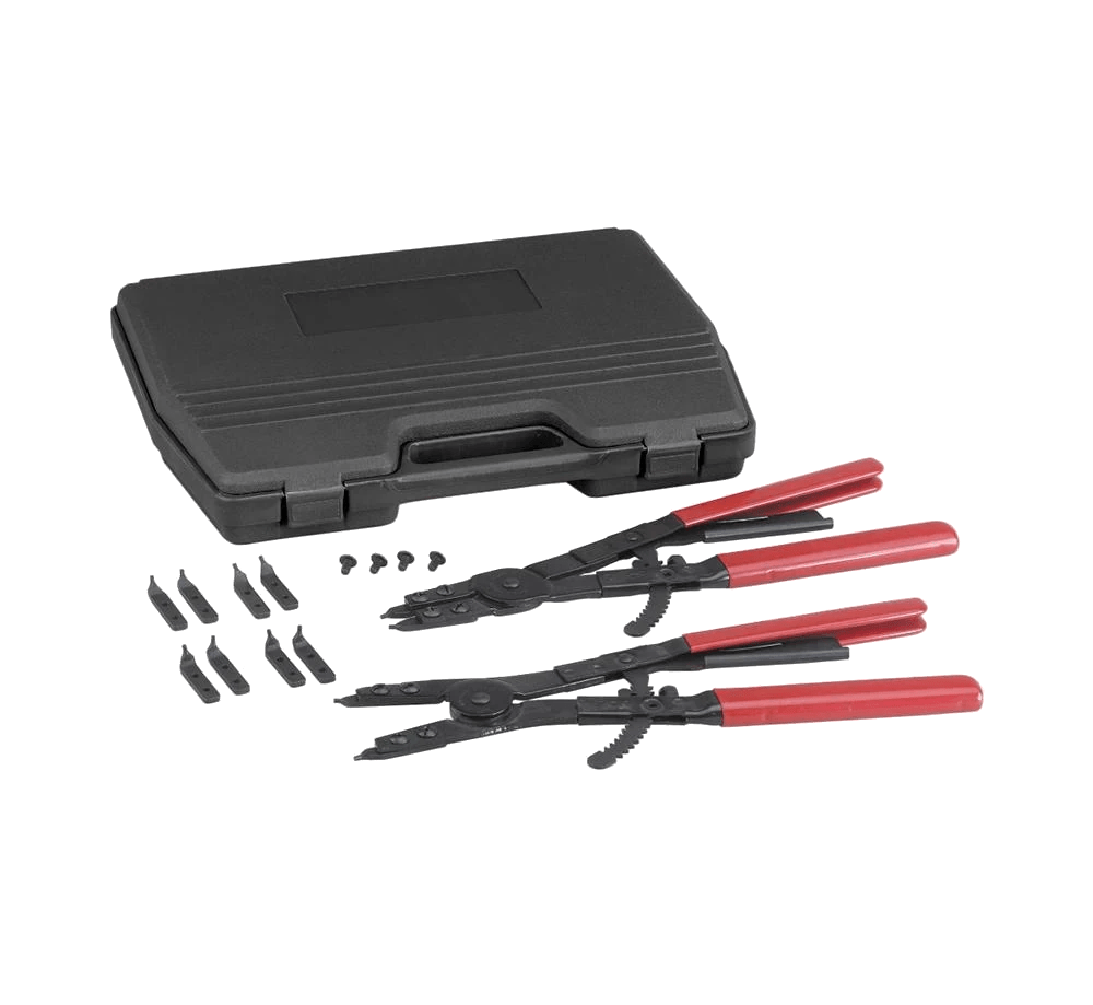 Replaceable tips and spring ratchet locking mechanism to securely hold against snap ring tension. Internal plier’s capacity 3-1/16″ to 6-1/4″ (78mm to 159mm) snap rings. External plier’s capacity 3-1/2″ to 6-1/2″ (89mm to 165mm) snap rings. Blow-molded storage case includes extra sets of replaceable 0.12″ (3mm) dia. tips: straight, 45°, and 90°.