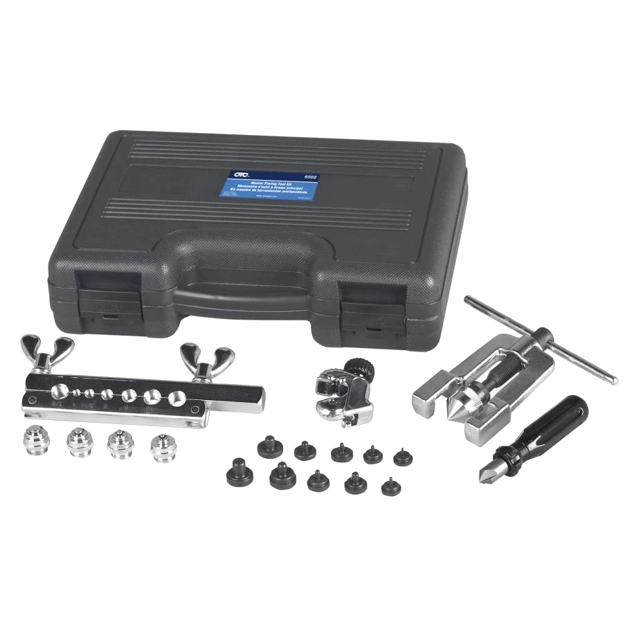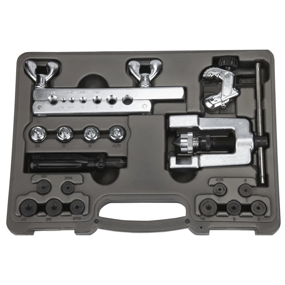 - Kit contains flaring bar, arbor press, adapters, tube cutter, deburring tool, all in a hard case