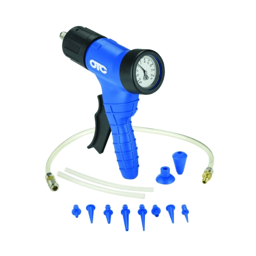 The patented design includes an intuitive rotary dial for quick switching between pressure and vacuum and an ergonomic pistol grip with lever. High-quality hoses with quick-couple fittings make quick work of hose/adapter changes and are leak-free under pressure or vacuum.An integrated rear-mounted gauge provides optimal viewing with testing up to 30 PSI pressure and up to 28 in Hg vacuum. It includes hose adapters, rubber adapters and plastic attachments for diagnosing EGR valves, fuel pressure regulators, thermal and electric vacuum switches, turbocharger waste gates, heating and ventilation control valves, central locking systems, MAP sensors and more. Stored in a convenient blow molded case. Covered by OTC’s Lifetime warranty.