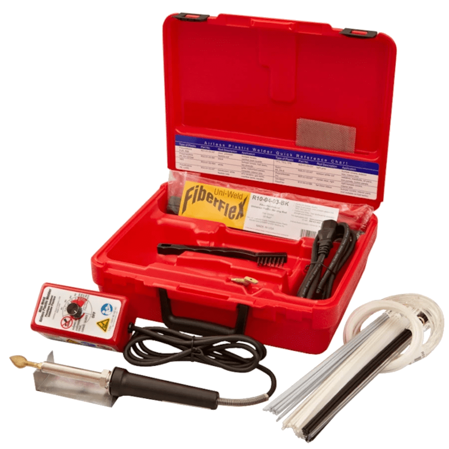 The temperature control can be taken out of the carrying case for more mobility. The Mini-Weld Model 7 Airless Plastic Welder is a complete kit that you can use to repair all kinds of plastic. This welder is NOT some stripped down kit. It’s a complete, ready-to-use kit that is jam packed with benefits. You will be able to weld high-melting-point plastics (like nylon radiator tanks) quickly and easily with the 200 watt ceramic core element. With seven types of standard welding rod, you will be able to match virtually any type of automotive plastic. Problem plastics like TEO, TPO, and Polypropylene are no problem to repair with the included FiberFlex universal rod. The kit also includes two different, easy-to-swap welder tips for applying all of the included welding rod. Finally, the temperature control box allows you to dial in the perfect temperature for welding whatever type of plastic you are working on.