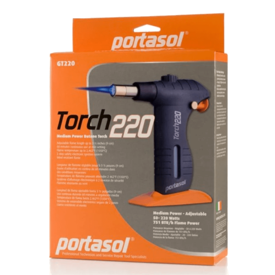 GT220 is a medium power butane torch with an adjustable output of 50-220 watts with an adjustable flame length of up to 9cm giving you 60 minutes continuous runtime at mid setting.