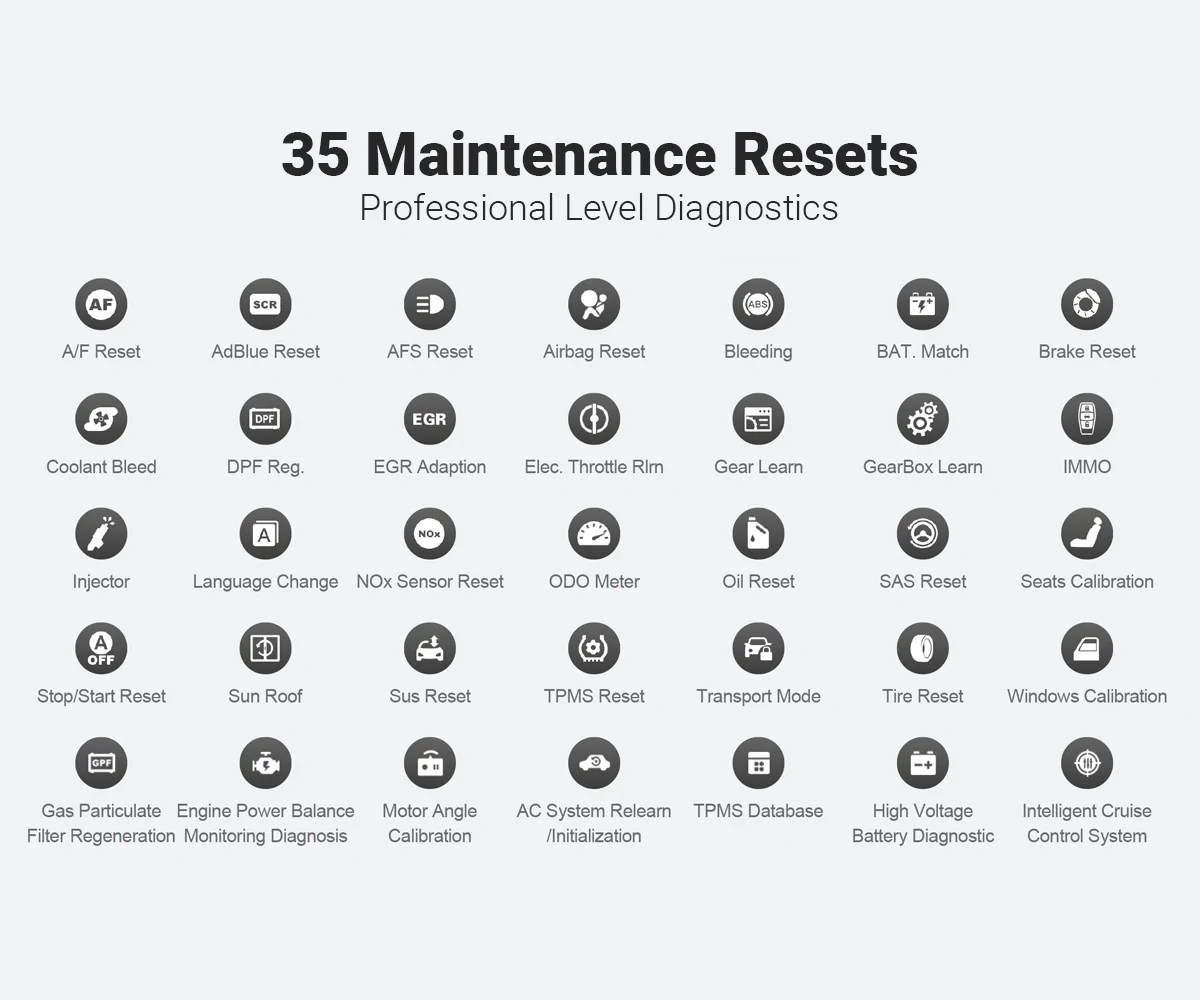 This car diagnostic tablet is an advanced professional automotive diagnostic tool with OE level special functions. This scan tool has Complete functions for technicians such as vehicle scan, read/clear fault codes, live data. Powerful full systems diagnostic capabilities with the latest in superior hardware. Supports Benz, BMW, Audi, Nissan, VW, Ford, GM and more. Supports up to 35 service maintenance resets, TPMS relearn and programming tool, ADAS feature, and covers 99% of vehicle brands on the market. This professional scan tool also has available printer, videoscope, work light, thermal imager, scope box, TPMS activation model, and battery tester ready to connect.