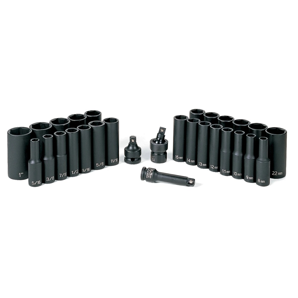 Set contains deep length Fractional sizes 5/16″ to 1″ and Metric sizes 8mm to 22mm plus a 3″ extension; 3/8″ x 3/8″ universal joint and 1/2″ F x 3/8″ M adapter.