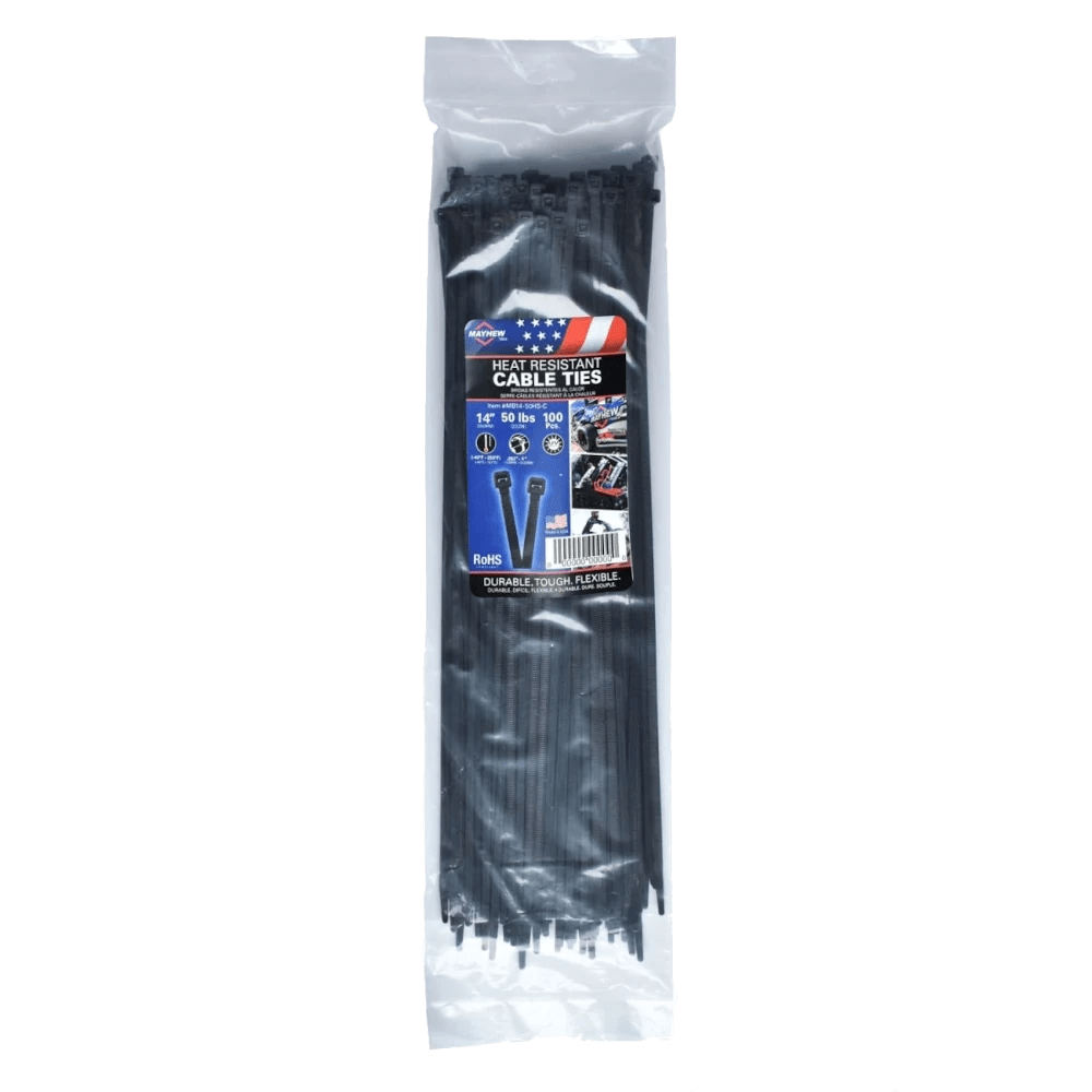 Professional Grade, American Made. These heat-stabilized cable ties can withstand temperatures of up to 250°F, accommodating fastening automotive cables and wires in high heat conditions without the worry of melting or warping. This line of heat stabilized cable ties are UV resistant, and are a combination of nylon 66 (which provides high mechanical strength and stability under heat and/or chemical resistance) and a heat stabilizing additive.