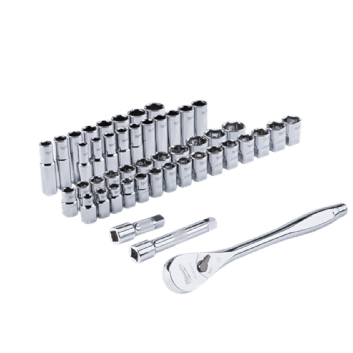 Our 47-Piece SAE & Metric 1/2″ Drive Ratchet and Socket Set offers better access in tight spaces and maximum tool strength. The 90-tooth ratchet tool offers 4°of arc swing and a slim profile design, so you can work in tighter spaces. The MILWAUKEE® socket set features an innovative wrench-compatible socket design with FOUR FLAT™ sides to help prevent rolling. The ½” drive ratchet has sockets with sizes stamped into the flats for easy-to-read visibility. Our optimized socket geometry additionally helps reduce bolt rounding and stripping. The Milwaukee ratchet and socket set includes a removable inner tray designed to be stored long-term in a steel storage chest and a durable carrying case for ultimate portability. The set’s accessories guarantee you have what you need to tackle every job, both in the garage and on the jobsite. The 47 Piece SAE & Metrics ½” Drive Ratchet and Socket Set is backed by a lifetime guarantee.