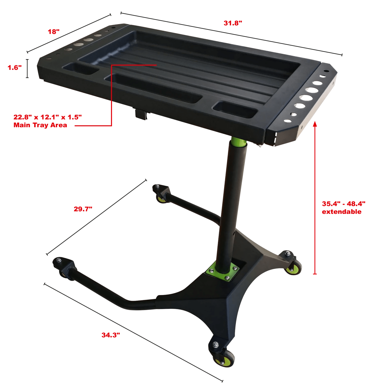 • Height adjustable support post adjusts from 35.4” to 48.4” for clearance of front ends on most vehicles